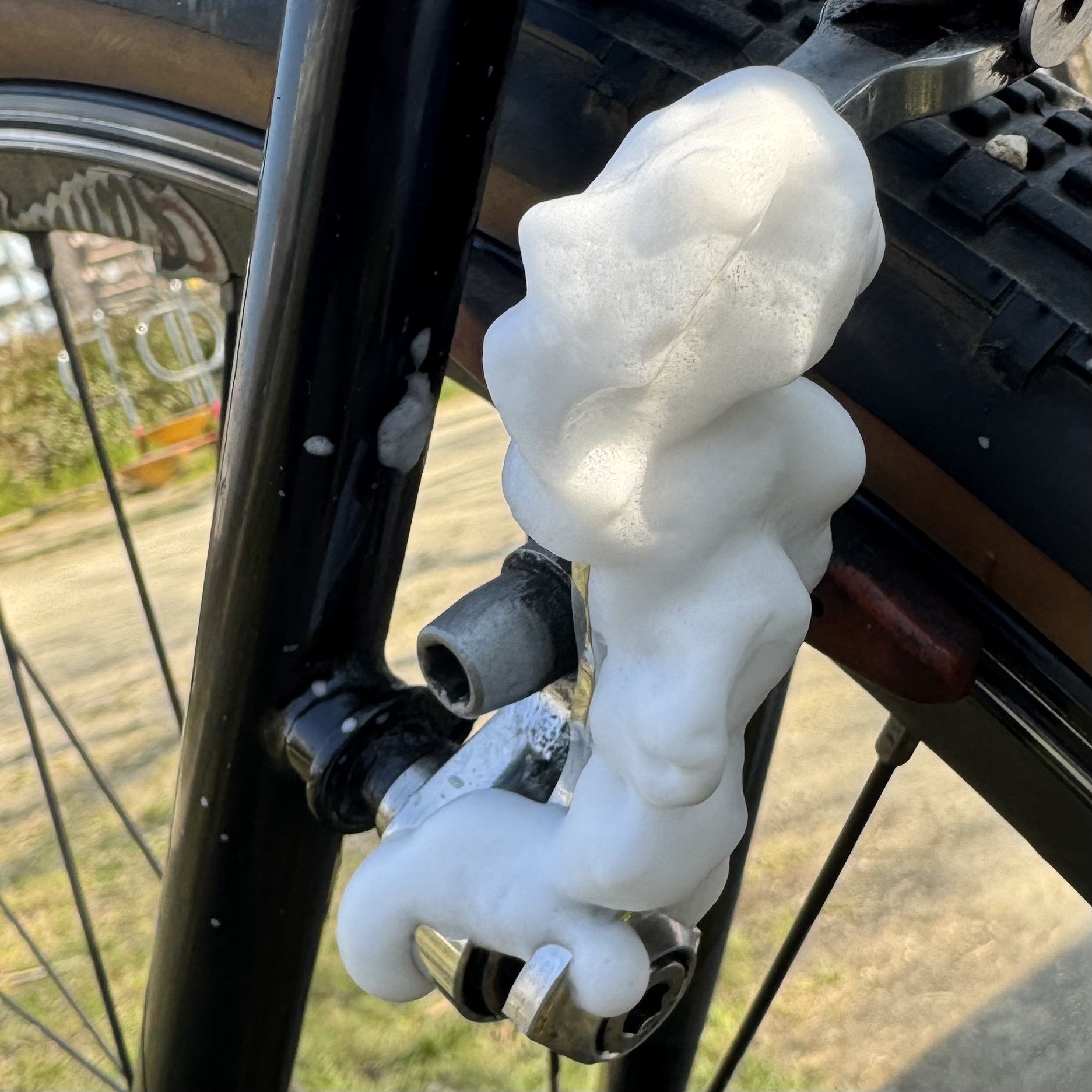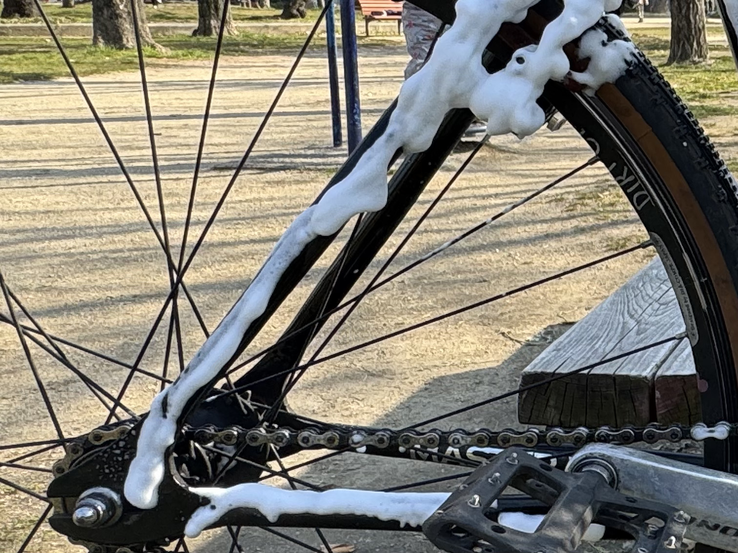特に、タイヤからの水撥ねとかを受けやすいフォーク下やブレーキ台座周り、BB周りやダウンチューブとかは、汚れが層になってこびりつきがち。